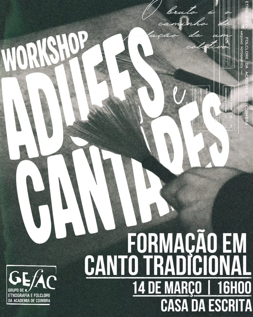 No âmbito da exposição “Bruto”, patente na Casa da Escrita, o Grupo de Etnografia e Folclore da Academia de Coimbra (GEFAC) promove, no sábado, dia 14, às 16h00, o workshop “Adufe e Cantares: Formação em Canto Tradicional”. A formação, orientada por Matilde Santana, vai ser dedicada ao repertório do Cancioneiro Popular Português e propõe uma imersão na cultura musical portuguesa, com especial enfoque no canto polifónico e no toque do adufe. O acesso ao workshop é gratuito, embora sujeito a inscrição prévia, através do endereço de correio eletrónico gefac.uc@gmail.com. Tem um limite de 12 participantes.
