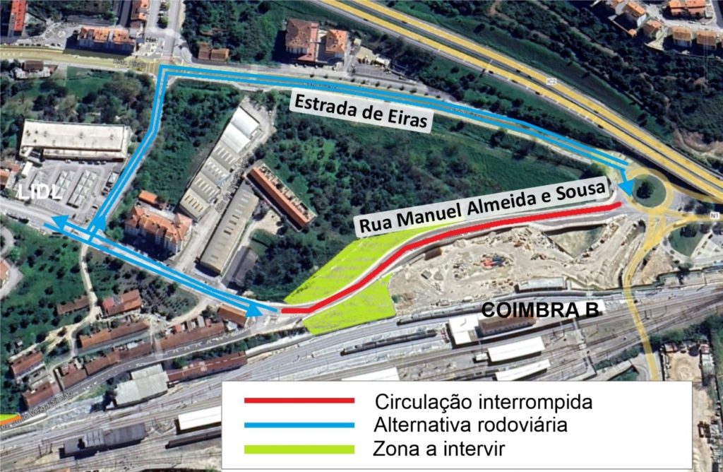 Assim, o trânsito deverá ser efetuado pela Estrada de Eiras e pela rua de ligação desta à Rua Manuel Almeida e Sousa, junto ao supermercado Lidl.
